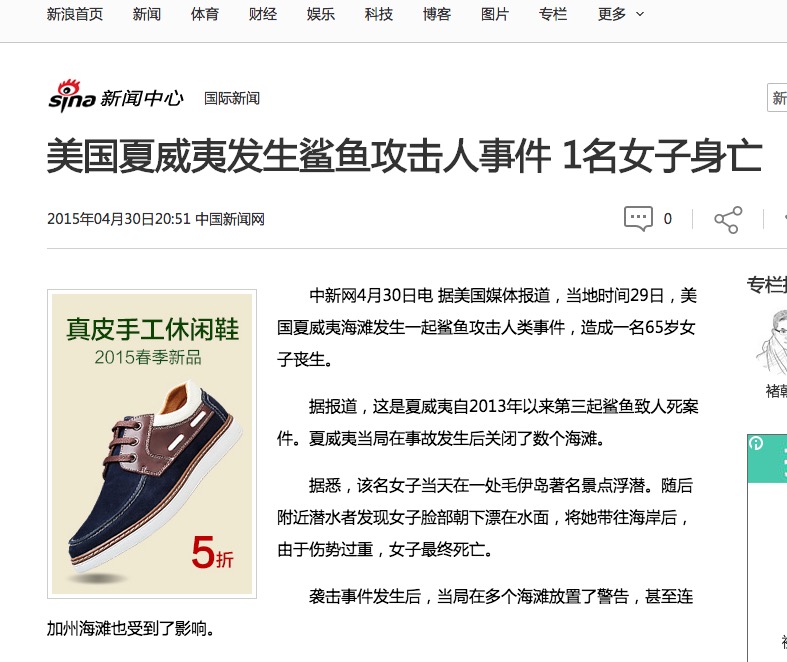 攻击鲨鱼的眼睛、鼻子或是鳃,它们的眼睛尤其敏感,这似乎能帮助鲨鱼认识到它所面对的并不是普通的猎物,上面第二则截图新闻里的主人公就是用的这招死里逃生的。