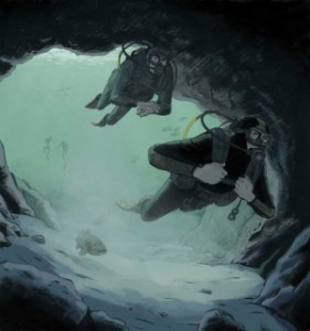 Al和Ray相顾彼此,笑了笑,感受着新鲜刺激的快感,和那明知不可为而为之的兴奋。他们在洞中游的越来越远,相互追赶着。当Ray意识到他已经看不到洞穴的出口时,他们知道有麻烦了!Ray抓住Al的脚蹼以引起Al的注意。Al转过身来,Ray做着手势表示不知那条路通往出口。Al耸耸肩----他也不知道。