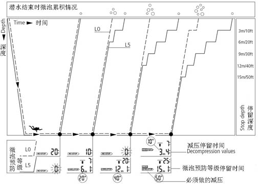 同时使用2只同样的潜水电脑,一隻设置成微泡预防等级L5,另一隻设置成微泡预防等级L0。你会发现L5的无停留潜水时间很快就用完了而且潜水员在做减压停留之前要做好几次微泡预防等级停留。正是这些微泡预防等级停留有助于消散微泡。