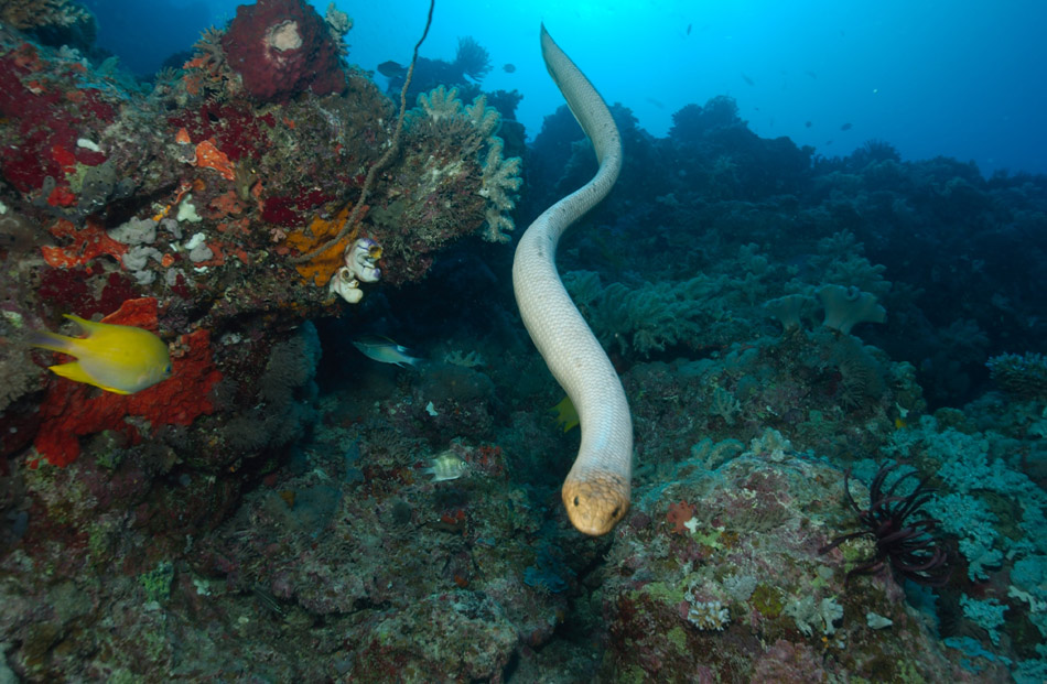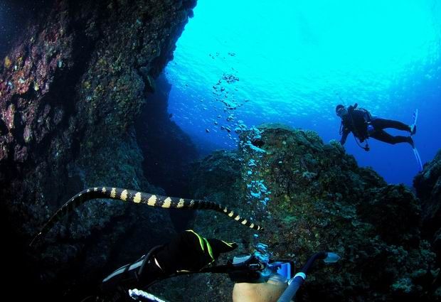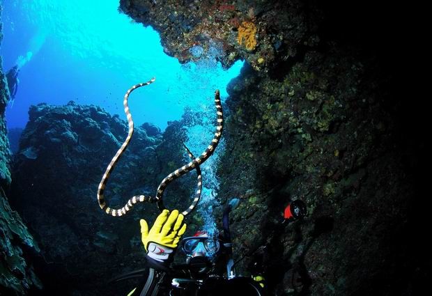 潜水多年从不曾抓海蛇玩,一方面是尊重,再方面还是有所忌惮,万一碰到哪条扁尾巴的家伙心情不爽,从不攻击人的这回破了戒,岂不自找麻烦,也不能对牠说「那么多潜水人为甚么只咬我?」搞不好它会回一句「因为你看起来就生的一幅倒霉相」….