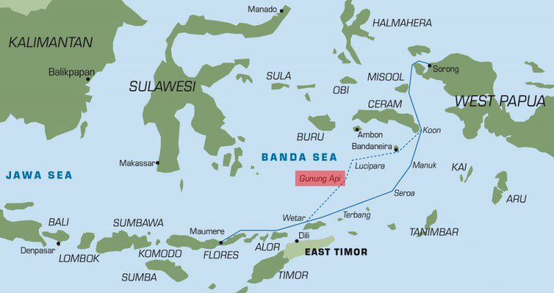 Gunung Api是一个小火山岛,在Banda Neira以西。最后一次火山爆发是在1988年,热熔岩从它的东北部和北部斜坡流动到班达海,破坏了现有的珊瑚礁系统。当地的村庄已被永久的撤离。然而在一段时间熔岩冷却后,在礁衬底形成了一个200米宽的的平台。由于电离作用以及熔岩内的矿物质,却为此地的珊瑚礁的生长提供了相当完美的条件。