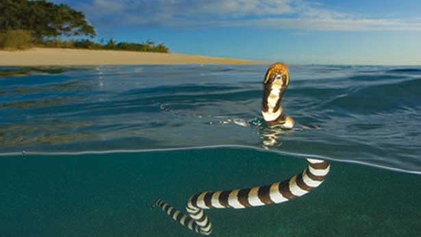 本来蛇是生长在陆上的爬虫类动物,怎么演化成以大海为秀场则有待专家解释,只知为了游泳方便尾部演化成扁平状以便于摇摆前进,呼吸构造也特别强化到可以一次换气在水里待2个小时,甚至皮肤也可分担5%的呼吸,从水中滤取空气。