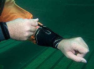 【小技巧】:走下水稍微游到深处。直到颈部,同时将颈部的迫紧环打开一指幅的宽度让空气排出。要小心,别让水从迫紧环进去。
