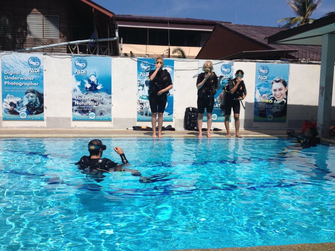 学员第一次穿戴装备,在泳池体验潜水,学会使用这些陌生的装备,面镜排水,呼吸器使用与巡回,模拟没有空气情况下潜伴之间使用对方备用气源,通过对潜水装备的充气排气结合自己的呼吸来控制自己在水中的浮力和升降,等等。