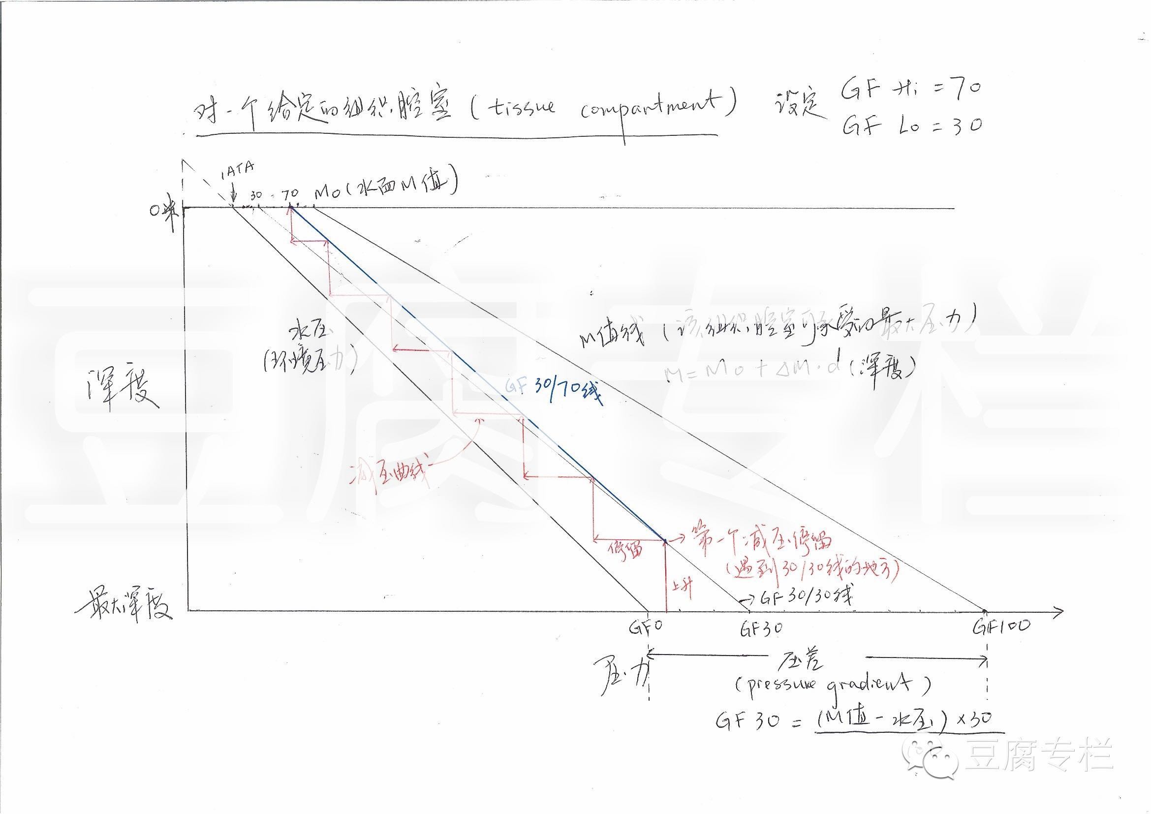 大家都知道,Buhlmann模型中有不同的组织腔室(tissue compartment)。对于每一个组织腔室,都有一组给定的M值,也就是该组织腔室在各深度下可以承受的最大压力。而所谓的GF(gradient factor),是将这个M值与环境压力之间的差(压差,pressure gradient)分成一百份,GF 30,就是离环境压力30,离M值70的意思。