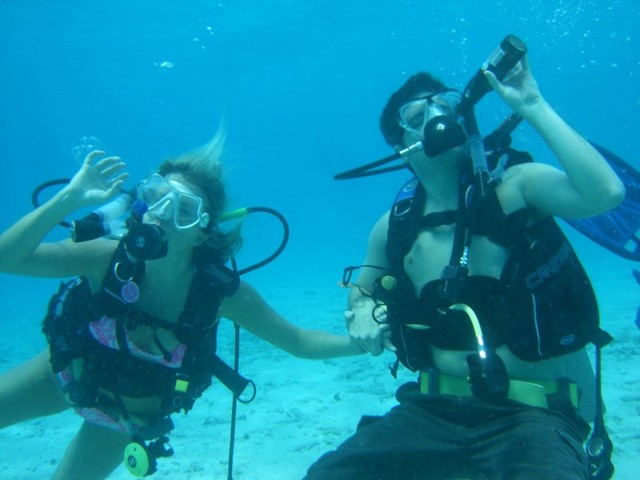在水下和朋友们一起吃东西喝饮料,是因为有这样切身的需要。当然这也是个有趣的话题,但是非常不建议新进潜水员,或者进阶潜水员在水下做这些事情,除非是由于深度和时间的需要。由于在水下必须要拿掉调节器才能完成这个任务,很容易呛水和窒息。你可以在水下吃喝吗?当然可以。那么休闲潜水员应该在水下吃喝东西吗?未必!