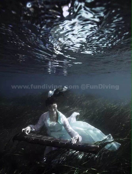 以前“几年都不穿一次裙子”的陆文婕有一组照片,其中一张,她穿着淡蓝色短旗袍,右手拿着一把团扇,沉在蓝黑色的水中,头顶的水面映出她纤长的倒影;另一张,她穿着白色古装裙,坐在河底的水草上弹一把古筝……这些照片拍摄于去年11月,是陆文婕和几个爱好水下摄影的朋友在佛罗里达州的一处淡水泉拍摄的。整个拍摄过程让“摄制组”格外狼狈:11月的佛罗里达,水温只有十几度,一行人在水下布置好场景、拍摄完一组照片,就赶紧上岸钻进车里,打开暖气,边喝热水边吹暖风,等身体暖过来,再回到水里拍摄下一组。