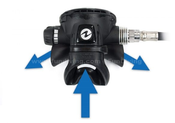 与我们敬畏的基于口腔的作用(打嗝、咳嗽、吐痰…等等),呕吐可以成功的透过二级头来完成。由于调节器的设计方式,从我们嘴里出来的任何东西都会透过咬嘴进入二级头舱室并经由排气阀排出。对于任何可能会卡住的东西,排气钮应该都能顺利的将其透过排气阀排出,但是要确保用你的舌头顶住上顎来保护并且小心的吸气以防异物再被吸入。如前所述,将二级头放置口中也可确保在异物排出后可立即恢复正常的呼吸。