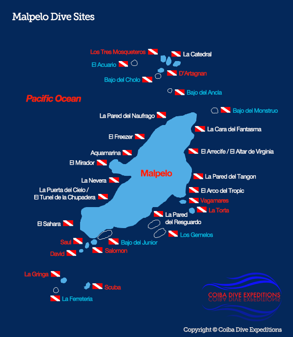 深度为30-50米的沙地,锤头鲨、加拉帕戈斯鲨、鹰鳐,海豚和琥珀鱼在这里随处可见,由于流很不规则,一般都是成组做放流潜,受南部季风的影响,马尔佩洛岛经常形成波涛汹涌的海面。这里也有初级的洞穴潜水,10米宽30米深。