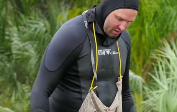 这并不是说斯丹菲尔德对鳄鱼无计可施,他上一次被鳄鱼攻击时,就带着个鳄鱼头的玩具避险。站在池塘仅到他腰身的地方,斯丹菲尔德用手擦了擦眉毛部位。这是佛罗里达州非常温暖的一天,可以穿短袖。不过48岁的斯丹菲尔德现在却全副武装着一身潜水衣,曾在看守所当过门卫的他现在的工作是在水里捡球,身材健硕的他背着个氧气罐,拖着个大大的网袋,看起来就像是个沼泽庞然大物。斯丹菲尔德的脚在池塘底下探索着什么,然后他捡起了一个沾满淤泥的“Top-Flite”牌高尔夫球。