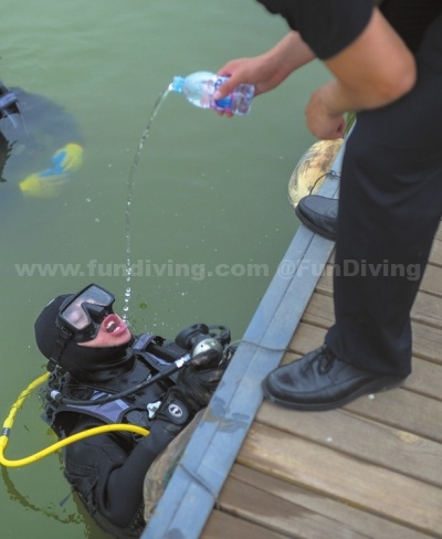 下午3点左右,水下特警背负的压缩空气瓶氧气使用殆尽,陆续浮出水面,一边和指挥员沟通在水下的经历,一边更换压缩空气瓶。