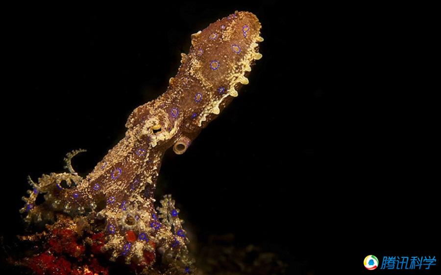 鱼和海洋动物肖像类作品一等奖:这是Beth Watson在印度尼西亚的蓝壁海峡拍摄到的蓝环章鱼。
