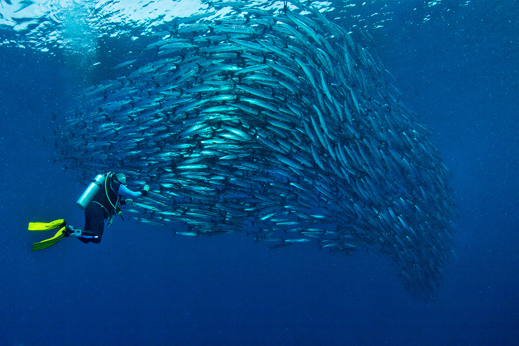 诗巴丹最受欢迎的潜点,潜水人俗称“海狼风暴”,这里说的“海狼”,也就是真金梭鱼和鬼金梭鱼,它们游水迅速,常集体追捕其他鱼类,极为凶猛,但通常不主动攻击人类。能遇到壮观的“海狼风暴”是非常让人激动的,想象一下人们就在它们身边游动着,甚至在它们移动的圈内,真是件令人兴奋的事。这里堪称世界上最好的观看海狼风暴的地点,每年世界各地的潜水员慕名而来想一睹海浪风暴所带来的震撼。