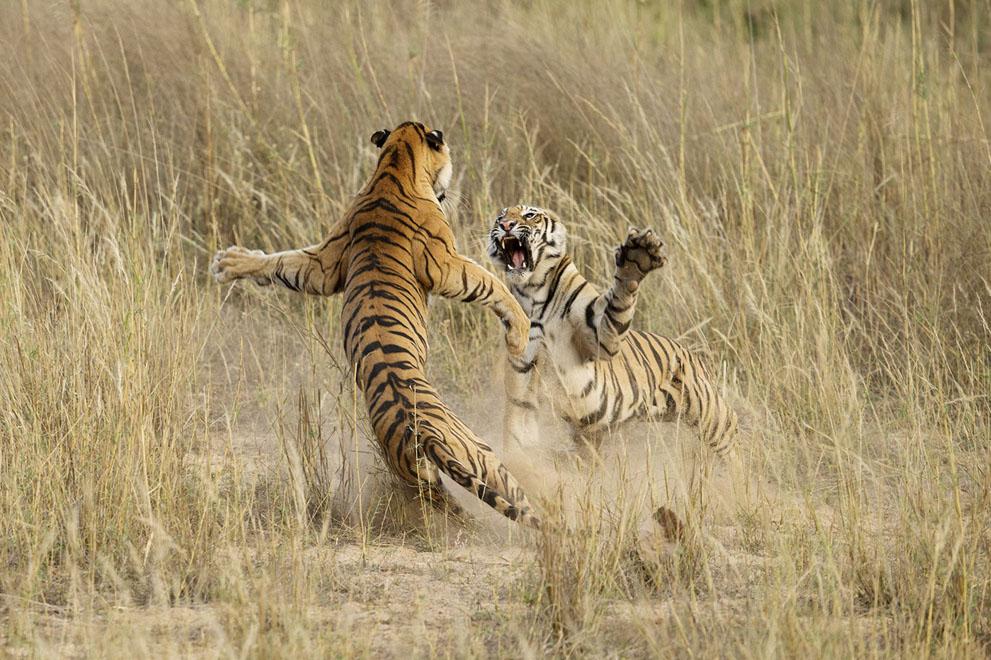 《自然》类提名奖:“肌肉力量”。两只即将成年的老虎之间的这场顽皮的打斗实在是人生中十分辉煌的机会,只持续了4到5秒的时间。黄昏将至,幼虎们正坐在草地上,突然一只幼虎悄悄地来到另一只的后面,这张照片抓拍了随后发生的事情。虎兄弟姐妹之间这种顽皮的打斗就是为他们在野生种生存做准备。这张照片完美地捕捉到老虎的真正威力,描绘出这些漂亮的猫科动物所拥有的纯粹的肌肉力量。2014年5月5日,印度中央邦班达迦国家公园。(美国《国家地理》杂志摄影大赛/ Archna Singh)