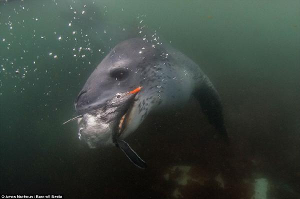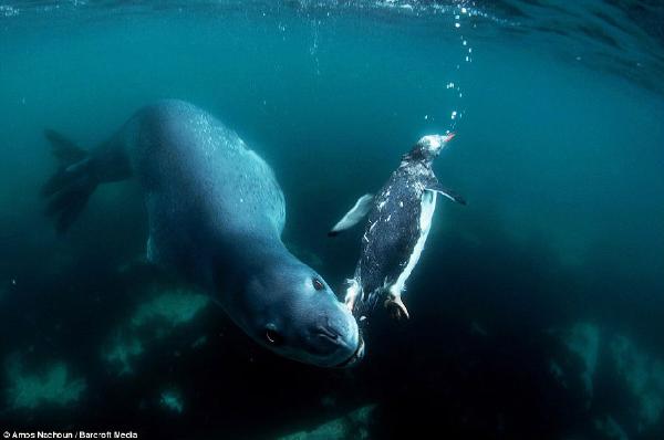 面对死亡 企鹅遇见了它的天敌leopard seal,在南极Port Lockroy 附近。 幼小的企鹅在浅水中玩耍,但是危险悄悄降临。