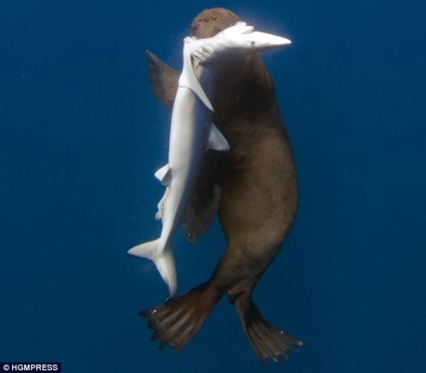 海豹攻击蓝鲨,这种镜头非常罕见。