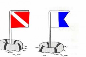 国际间对休闲潜水都有共识,潜水现场一定要竖立潜水旗。船只看到水域竖立潜水旗时不得靠近100呎/30公尺以内,应绕道避开通过,以防止伤害上升中的潜水人员。如果水面狭窄必须接近,就应该观察泡沫,谨慎通过。关于潜水旗