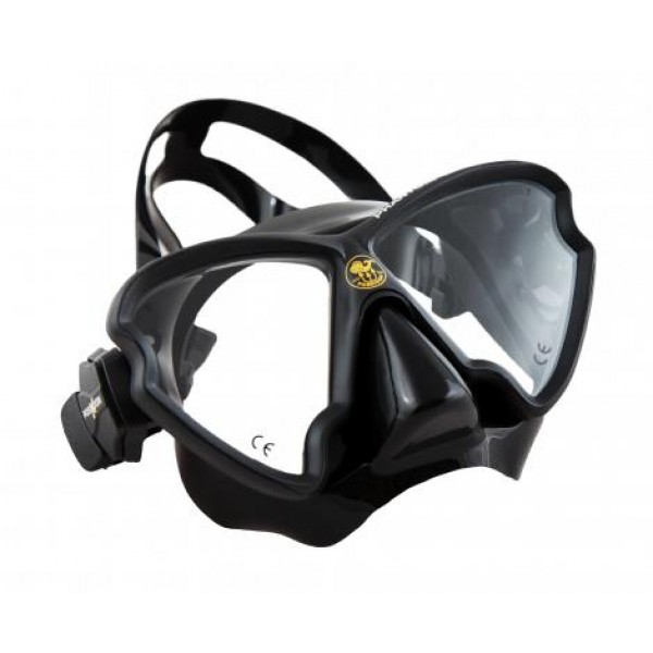 这款面镜的外形很炫酷,它是双镜片面镜,大视野小容积,适合大多数脸型,有灵活的面镜扣系统。PVC框,有黑色、透明的硅胶裙边可选择。