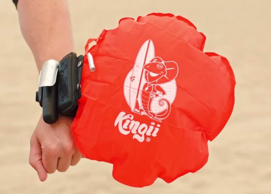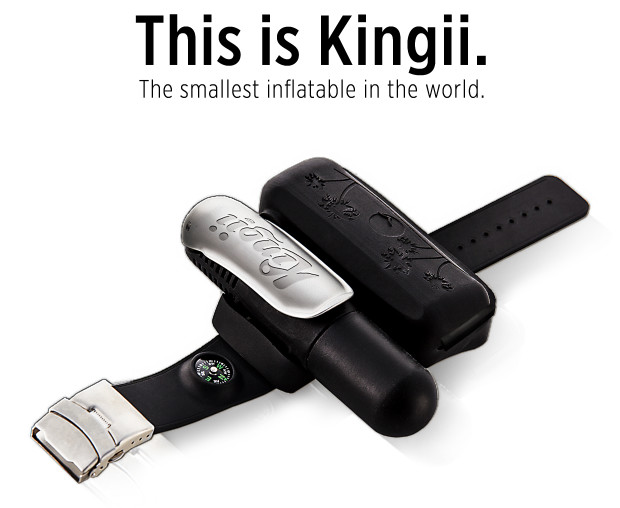 每年浮力救生衣都能防止上千人溺亡,但许多人会因为舒适、时尚 或空间不够等理由选择不穿它们。Kingii推出了世界上第一款最小的 充气救生装置作为替代。这款腕带设备的目标人群是游泳运动员、 冲浪者、海员和任何想要下水的人。 该腕带由装入小袋子中的尼龙皮囊和一个装有二氧化碳的气缸两部分组成,这两部分由一根腕带连接在一起。拉动腕带上的一个杠杆,腕带上亮橙色的皮囊就会一秒鼓起,让使用者紧急悬浮起来。