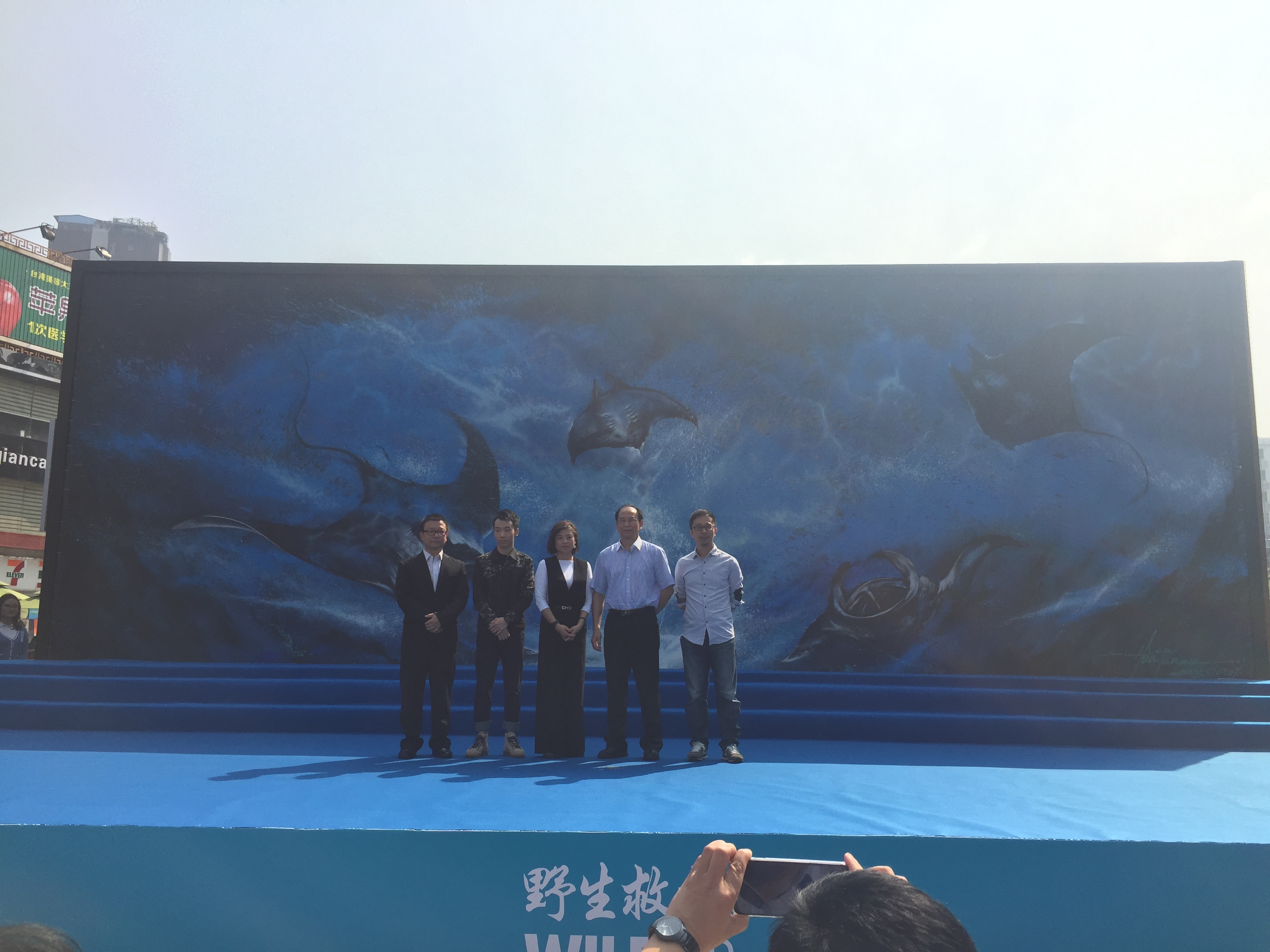 以“画图男”一名成名的广东本土艺术家陈英杰为此项目手绘了巨幅壁画《蓝梦》。《蓝梦》以中国国画元素结合西方涂鸦艺术的形式,展现了蝠鲼的美丽与神秘。在项目启动仪式上,野生救援中国首席代表子雯女士、农业部长江流域渔政监督管理办公室主任、全国水生野生动物保护分会李彦亮会长、百信广场代表黄晓丹先生、广东广播电视台新闻中心民生部总监卢战先生和艺术家陈英杰共同为壁画揭幕,正式启动“2015年度蝠鲼保护项目,一直致力于通过宣传呼吁大众停止食用蝠鲼鳃。因为‘没有买卖,就没有危害’。蝠鲼已经日益濒危,它们应当遨游在海洋中,而不是出现在我们的饭桌上。”