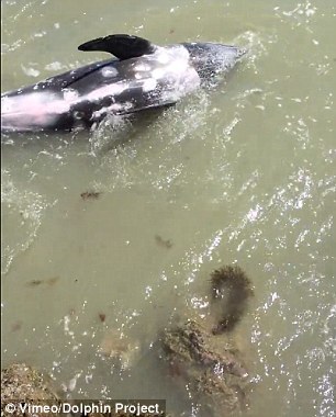 北京时间9月16日消息,据英国《每日邮报》报道,海豚保护者瑞克·欧贝瑞(Ric O'Barry)近日在日本太地町拍摄下一段令人心碎的视频。一只为了躲避捕杀的海豚冲到了海岸岩石上,在即将搁浅的时候被赶来的渔民又拖回了海里。