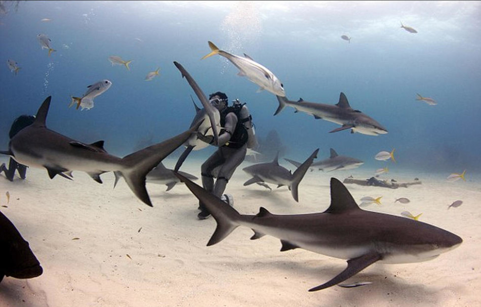 潜水员抚摸鲨鱼的鼻吻部让它们平静和放松下来,甚至可以让它们进入无意识状态以便研究者操作。