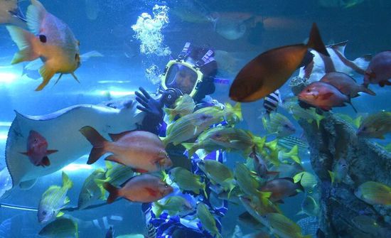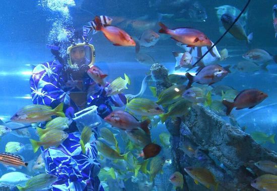 活动中,女性潜水员身穿华丽的夏季和服潜入水中为鱼群喂食。潜水员进入水族箱后,五颜六色的鱼儿环绕着她游来游去,鱼群与色彩鲜艳的夏季和服互相映衬,十分漂亮。