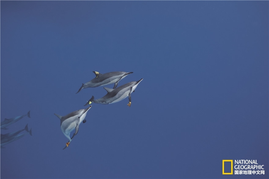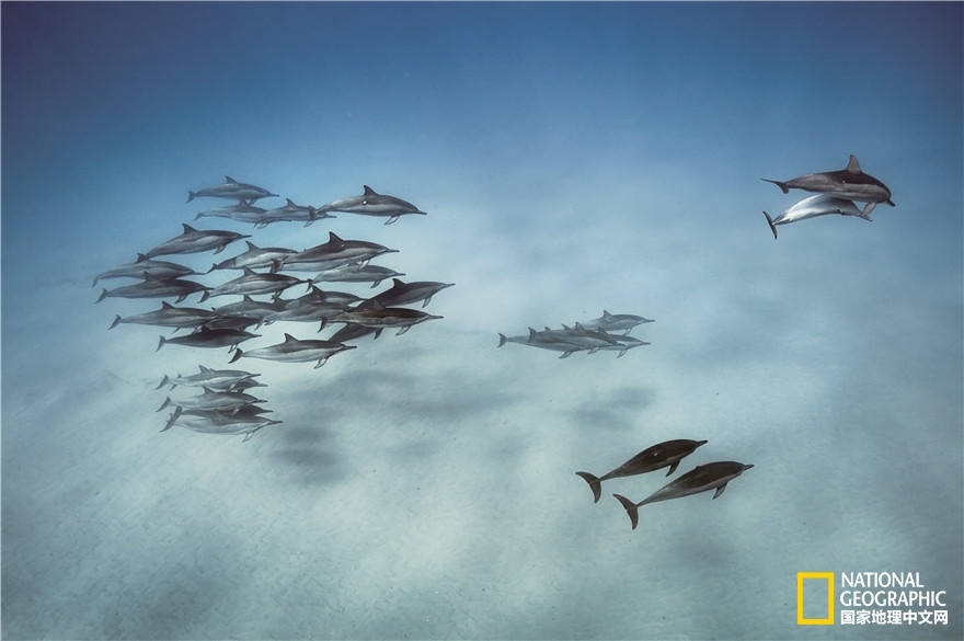 长吻原海豚从夏威夷瓦胡岛附近的一处海湾捕食归来。作为一种善于交流的群居动物,长吻原海豚的群体成员可达数千名之多。