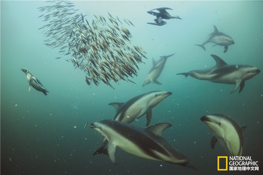 海豚是一种具有高度社会性的生物,它们团结协作,运用十分巧妙的策略捕食猎物。生活在巴塔哥尼亚近海的暗色斑纹海豚将凤尾鱼群驱赶成球形,然后轮番吞食。两只鸟类——麦氏环企鹅和海鸥——前来趁火打劫。