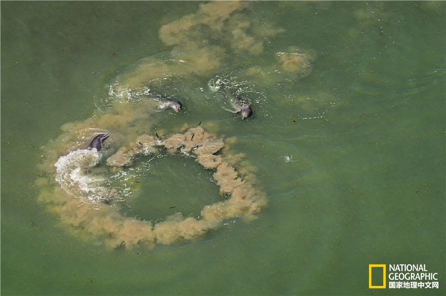 佛罗里达湾的宽吻海豚发明出一种独特的捕鲻鱼妙招,它们用搅起的环形泥沙屏障把鱼困住。鱼往泥沙圈外跳跃逃跑时,恰好会落入等在一旁的海豚口中。