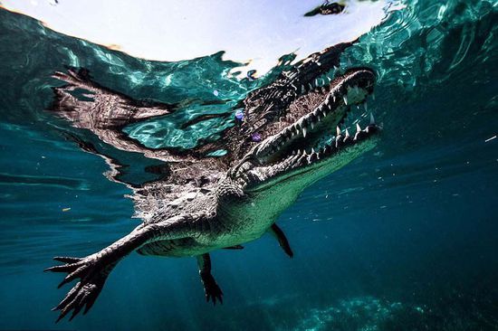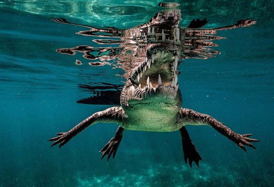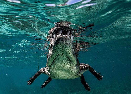 水下摄影师卡斯蒂洛在古巴附近水域抓拍到咸水鳄照片