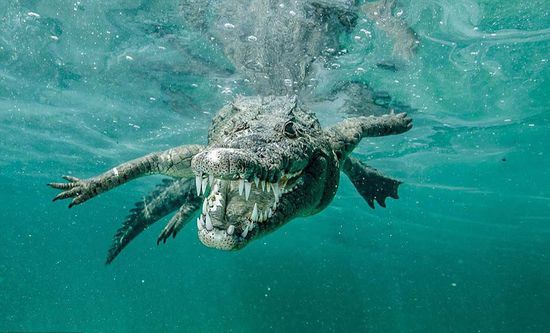 据英国《每日邮报》6月25日报道,喜欢冒险的墨西哥水下摄影师里卡多卡斯蒂洛(Ricardo Castillo)日前在古巴女王花园海洋公园度假,原本希望能够抓拍到鲨鱼照片。但他却遭遇了另一种水下掠食者――咸水鳄。