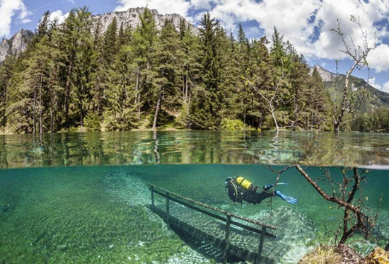 积雪消融,将原本陆地上的树木、栈道等悉数没入水中,这是一期一会的奥地利绿湖