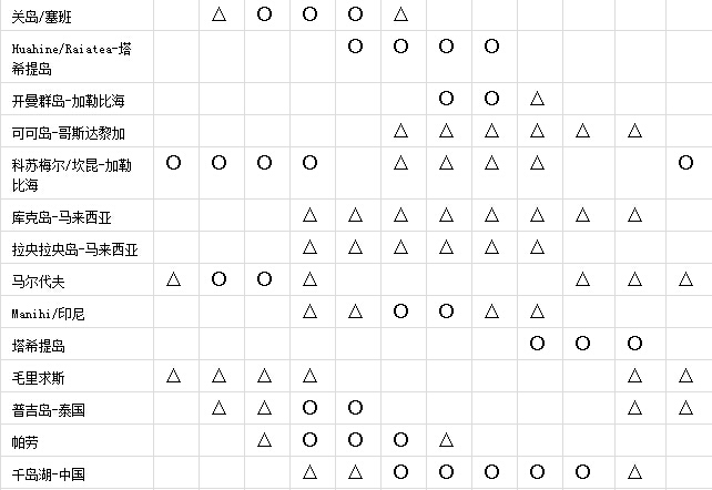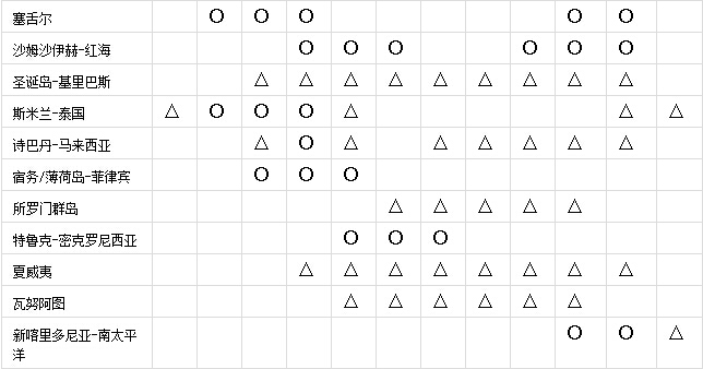 上图包括大西洋和加勒比海,地中海和红海海域的潜点。以第一条为例:巴哈马的little Bahama bank潜点,最大深度15米,最佳潜水季节9月-4月,简单,看点是和海豚同游,能见度30米,弱流。