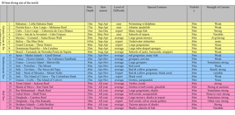 下面两张图是全球50最佳潜点的详细信息,包括潜点名字,最大深度,最佳季节,难易程度,看点,能见度和流的强弱。图片看起来很小,请保存在手机上放大查看。(要是有哪位好心人能制成中文表格,也请发给我一份)